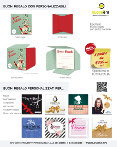 Un “Buono Regalo” che faccia parlare di sè, attiri l’attenzione del cliente finale e sia un cadeaux gradito al destinatario finale. Il Natale è alle porte e Nuovaera ha voluto pensare a tutti i suoi clienti che hanno un’attività commerciale e che ogni anno si ritrovano a non sapere come valorizzare i propri prodotti, magari suggerendo ai propri clienti la possibilità di acquistare presso di loro un “buono regalo”, da donare in occasione delle festività natalizie, ma anche per compleanni e ricorrenze, ad amici, parenti, mariti, mogli e chi più ne ha più ne metta. Ecco allora un bellissimo ed originale “buono regalo”, in un formato pratico, facile da esporre al bancone o alla cassa, 100% personalizzabile nella grafica e nelle informazioni da aggiungere, elegante e stiloso, bello per chi lo acquista e per quanti poi lo riceveranno. Nuovaera, ha realizzato un’apposita fustella autoincastrante, formato 10×10 cm, sul quale creare una grafica accattivante e speciale, per celebrare occasioni altrettanto speciali e far felice la persona a cui sarà donato questo originale buono spesa. La plastifica opaca sulla parte esterna dona resistenza e classe al “buono regalo”, garantendo una durata nel tempo al prodotto che, quindi, ogni commerciante potrà proporre lungo tutta la durata dell’anno e per anni. All’interno, la possibilità di lasciare uno spazio, interamente personalizzabile, sul quale indicare i servizi donati, la durata della validità del “buono” e eventuali altre indicazioni necessarie a personalizzare il regalo.
